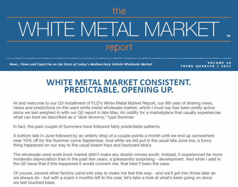 The Q3 2025 White Metal Market Report highlights an unexpectedly stable used wholesale work truck market. Traditionally, prices fall 10–12% during summer, but this year depreciation was only 5–6%, signaling strong demand despite economic pressures. Scarcity of low-mileage, high-quality assets—stemming from limited production in 2021–22—continues to drive values, while fleets are holding onto older, high-mileage […]